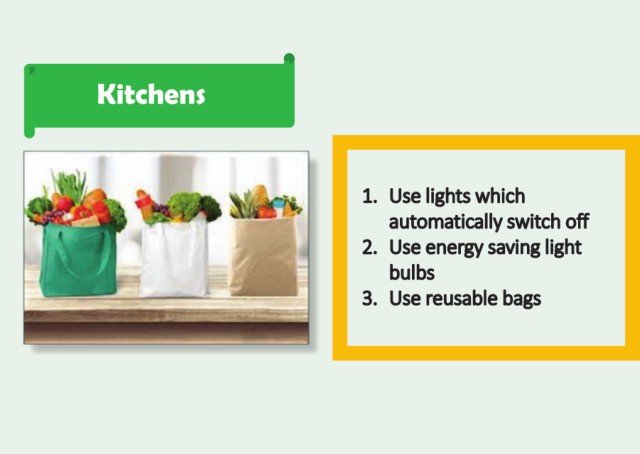 Kitchens 1. Use lights which automatically switch off 2. Use energy saving light bulbs 3. Use reusable bags
