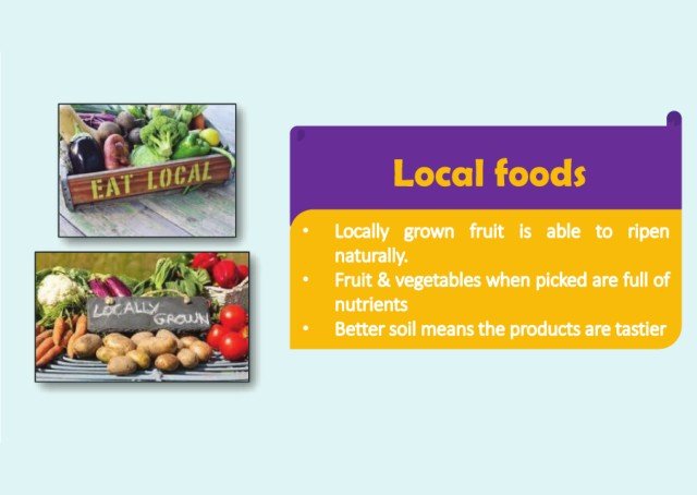 Local foods Locally grown fruit is able to ripen naturally. Fruit & vegetables when picked are full of nutrients Better soil means the products are tastier