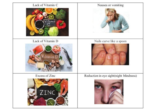 Lack of Vitamin C Nausea or vomiting Lack of Vitamin D Nails curve like a spoon Excess of Zinc Reduction in eye sight(night blindness)