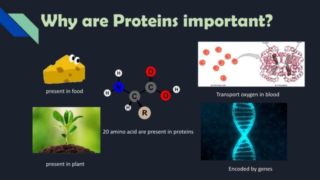 Why are Proteins important? present in food Transport oxygen in blood 20 amino acid are present in proteins present in plant Encoded by genes