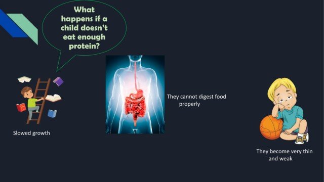 What happens if a child doesn’t eat enough protein? They cannot digest food properly Slowed growth They become very thin and weak