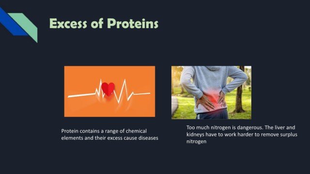 Excess of Proteins Too much nitrogen is dangerous. The liver and Protein contains a range of chemical kidneys have to work harder to remove surplus elements and their excess cause diseases nitrogen